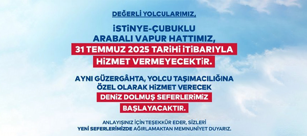 İBB iştiraki Şehir Hatları, 31 Temmuz 2025 itibarıyla İstinye–Çubuklu arabalı vapur hattının hizmet vermeyeceğini duyurdu. Yapılan açıklamada, aynı güzergâhta yolcu taşımacılığına özel olarak deniz dolmuş seferlerinin başlayacağı belirtildi. Açıklama şöyle oldu: