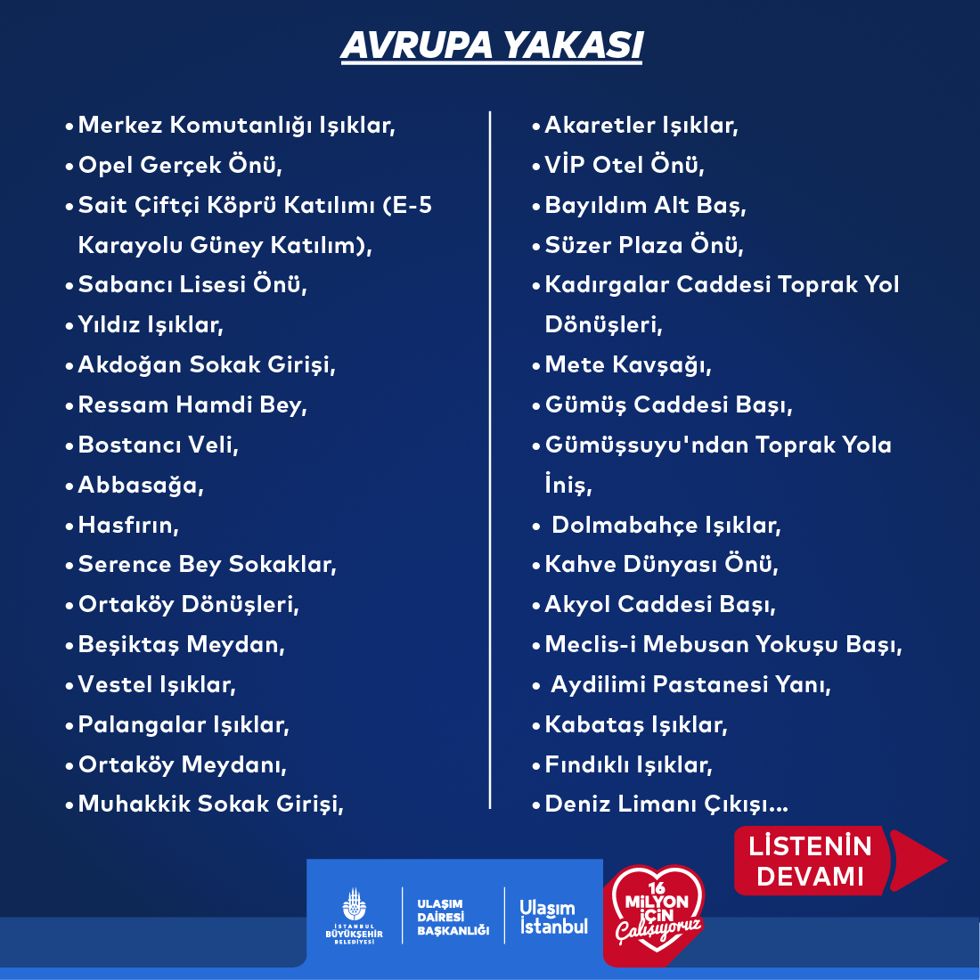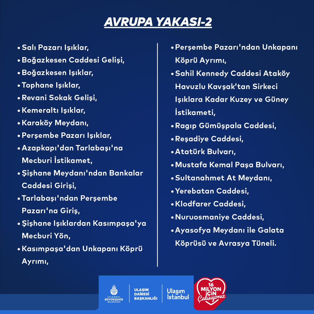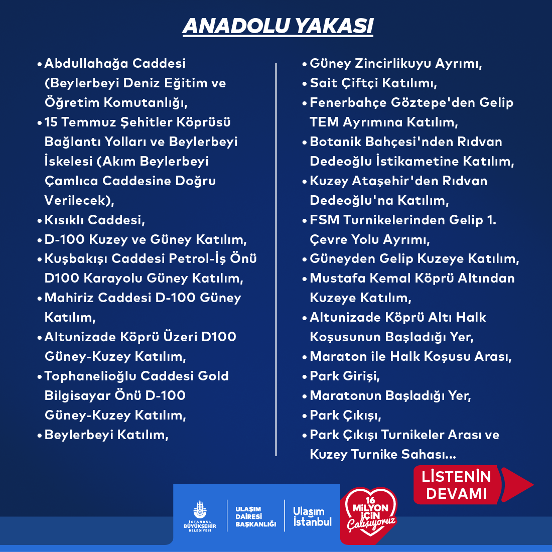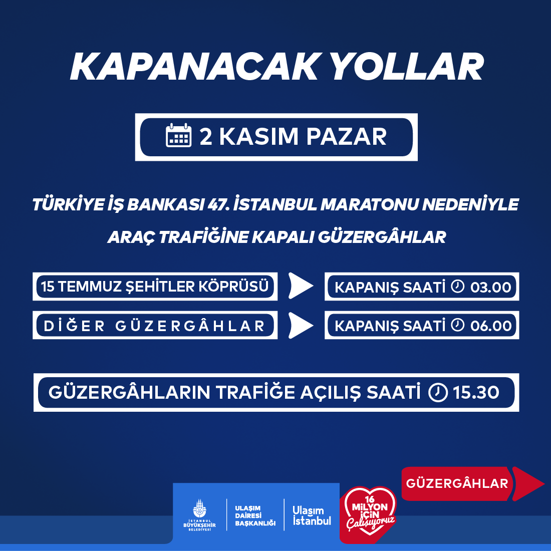 2 Kasım 2025 Pazar günü düzenlenecek olan İstanbul Maratonu nedeniyle bazı yollar araç trafiğine kapatılacaktır. Trafiğe kapatılacak yollar ve alternatif güzergahlar görsellerdedir.