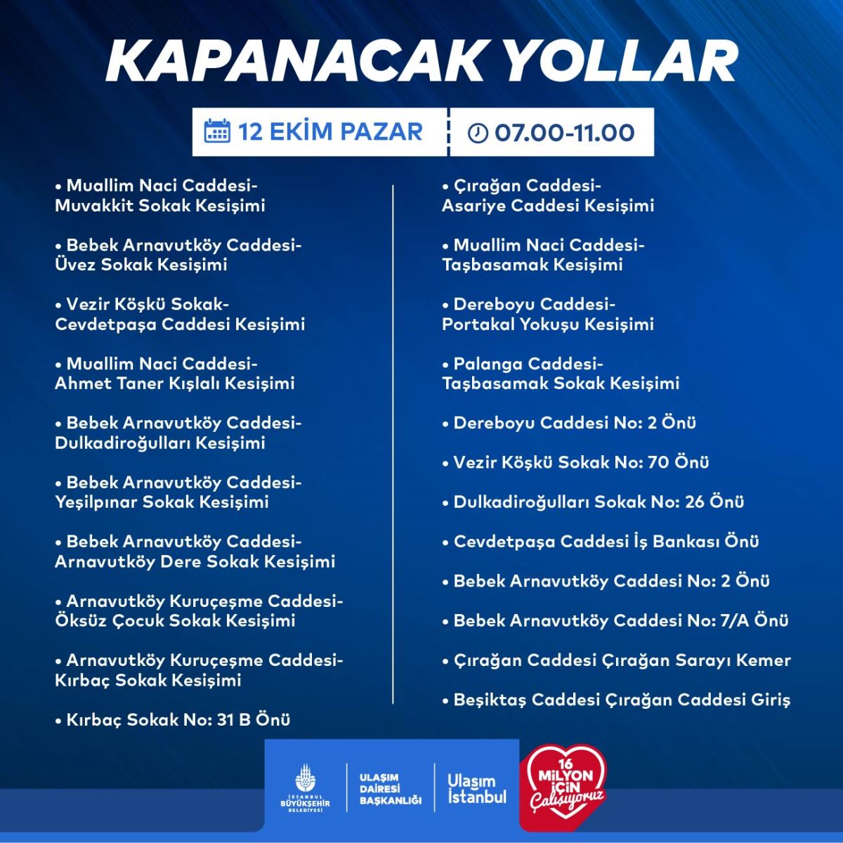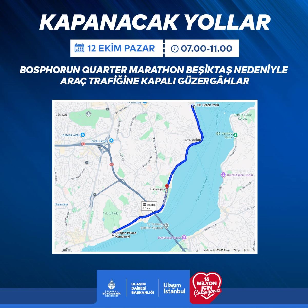 12 Ekim Pazar günü yapılması planlanan Bosphorun Quarter Marathonu nedeniyle İstanbul'un bazı noktalarında trafiğe kapatılacak yollar aşağıdadır.