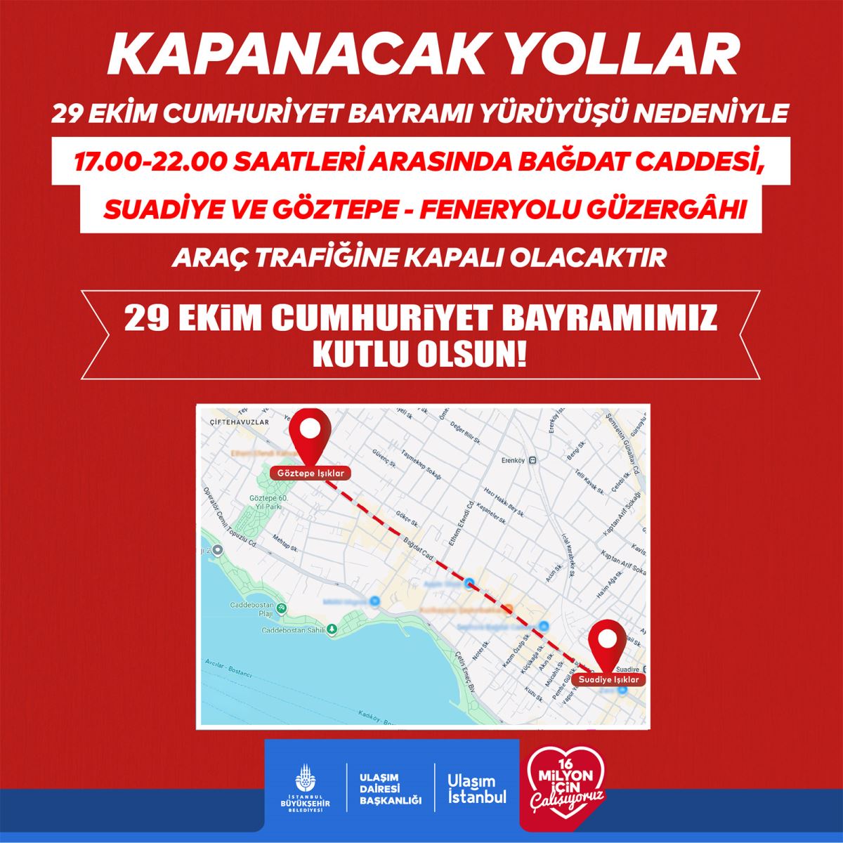29 Ekim Cumhuriyet Bayramı nedeniyle saat 17.00-22.00 saatleri arasında Kadıköy'de Bağdat Caddesi, Suadiye ve Göztepe - Feneryolu güzergahı araç trafiğine kapalı olacak.