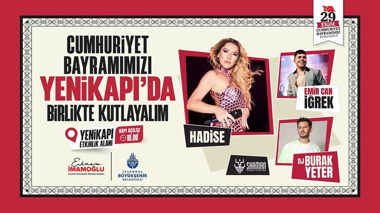 İstanbul Büyükşehir Belediyesi (İBB), Cumhuriyetimizin 101. yıl dönümü kutlamaları için hazırlıklarını tamamladı. 29 Ekim Cumhuriyet Bayramı haftası boyunca konserler, söyleşiler, sinema gösterimleri ve çocuklara yönelik atölyelerle, her yaşa hitap eden zengin bir program sunulacak. Cumhuriyet Bayramı’nın coşkusu, 29 Ekim akşamı Yenikapı Etkinlik Alanı’nda düzenlenecek halk konseri ile zirveye çıkacak. DJ Burak Yeter, Shaman, Emir Can İğrek ve Hadise gibi sevilen sanatçılar, İstanbullularla buluşacak.