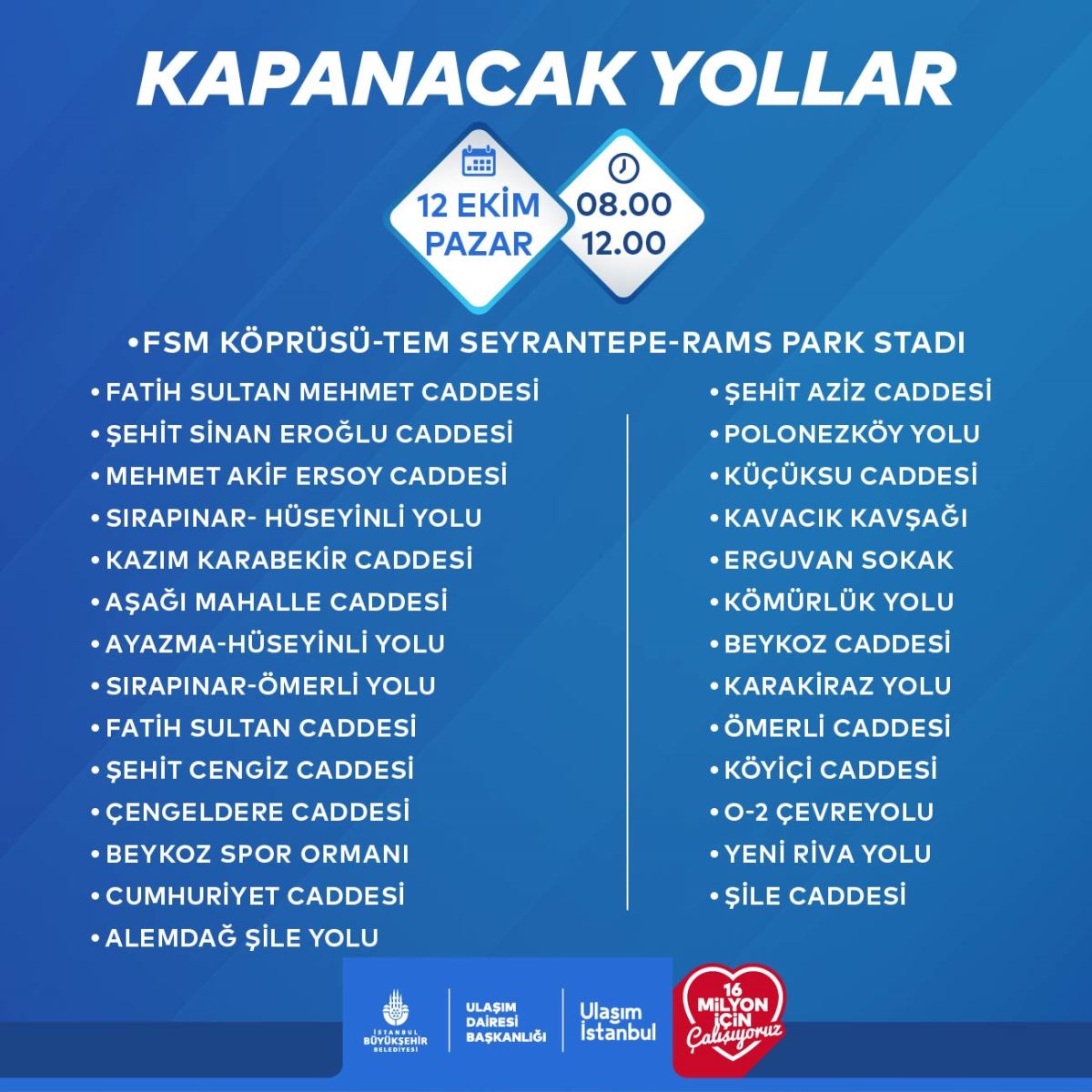 İstanbul da 12 Ekim Pazar günü Tour de France’ın yol bisikleti resmi amatör serisi L’Étape Türkiye by Tour de France bisiklet yarışı nedeniyle trafiğe kapatılacak yollar aşağıdadır.